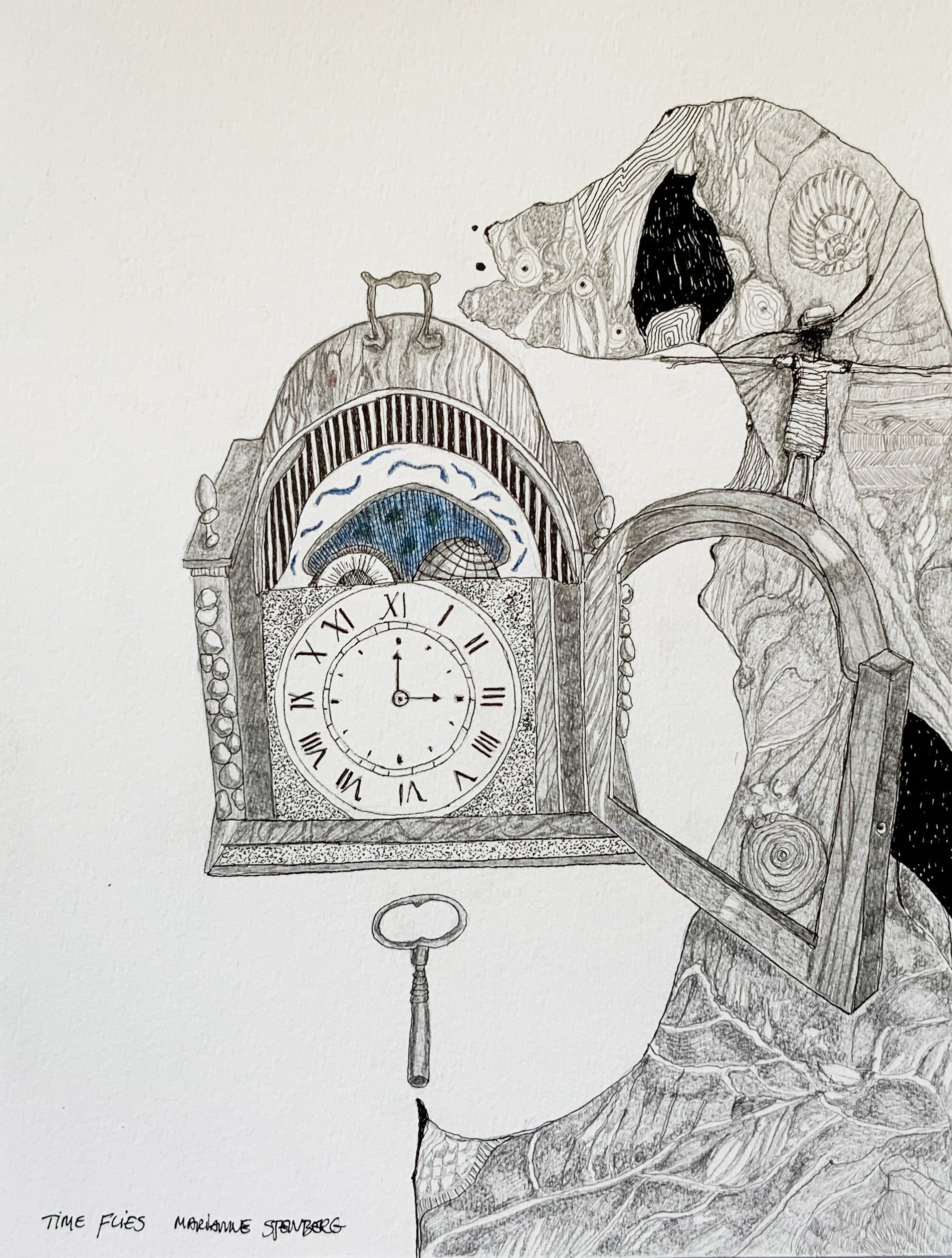 Tegning, blyant og tusch på papir